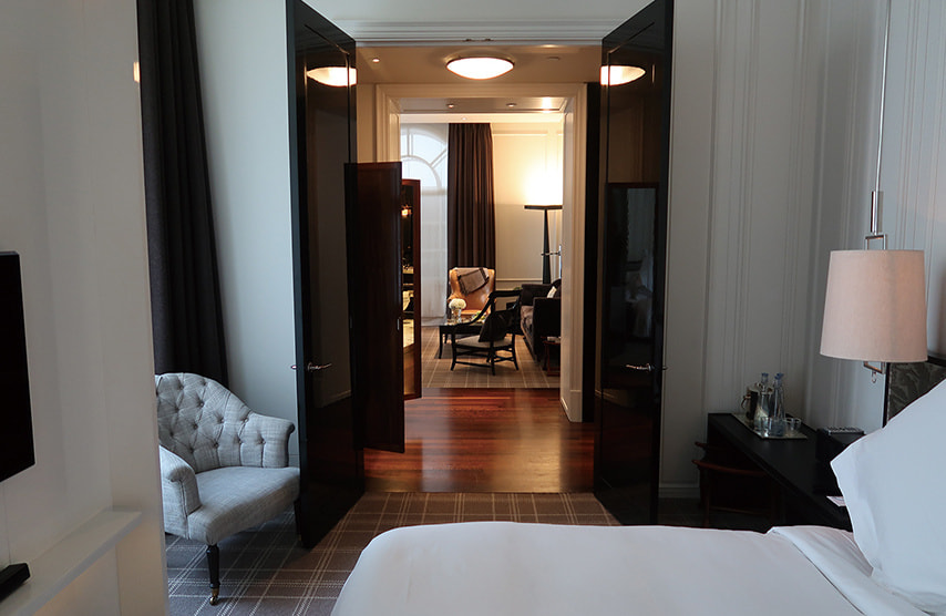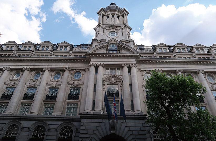 ローズウッド ロンドンはシティとウェストエンドの間、ハイ・ホルボーン通り沿いに位置し、建物の中央上部にドーム状のクーポラを配置した独特の外観は威厳さえ感じる。ホテルゲストはエドワード朝の壮大な中庭に通じるアーチ道を通って正面エントランス車寄せに到着すると、ある種の高揚感が湧いてくる。ホテル所有のリムジン“JaguarXJL Saloon”での送迎なら尚更のことであろう。ゲストの到着と同時に爽やかなサマースーツのベルスタッフたちが軽快にトランク類を運び、専任バトラーが挨拶をしてゲストを部屋に案内する。