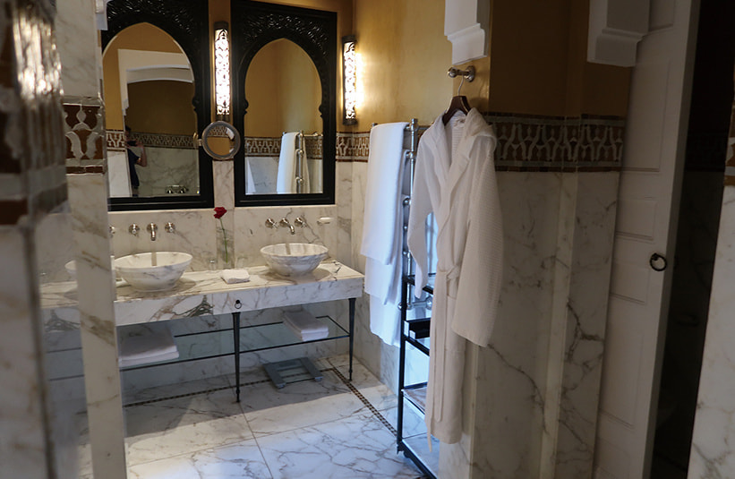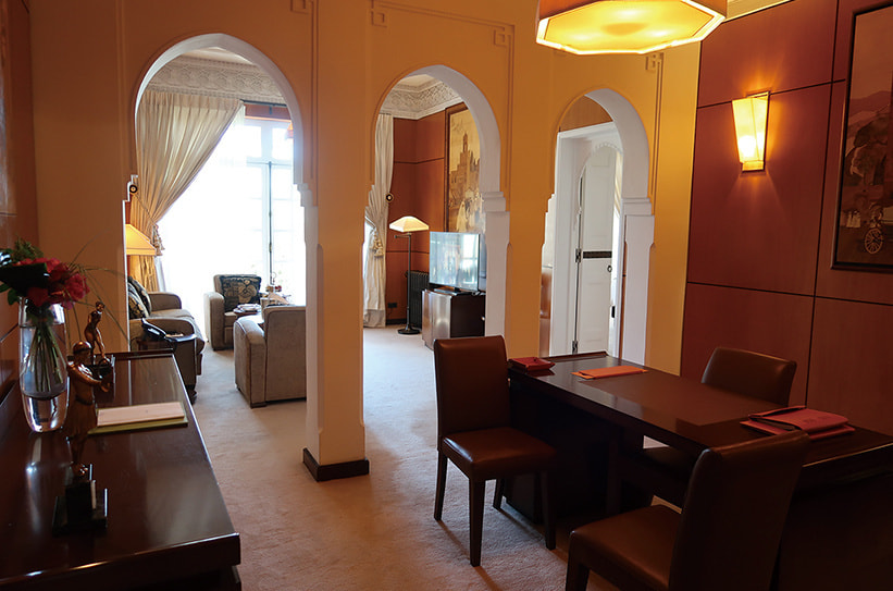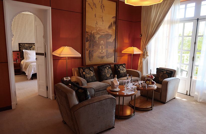 ラ マムーニアはスイートを含む全207の客室と3軒の戸建てリヤドを擁して広大な敷地に佇んでいる。正面エントランス車寄せに到着すると、モロッコの伝統衣装を纏ったドアマンが笑顔で迎えてくれる。今回は約150㎡の広さを持つシグネチャースイート「The Marqueterie Suite」を紹介したい。2ベットルームとミーティングルームを擁したスイートで、名称のMarqueterie は“寄せ木細工”とも訳され、木片を組み合わせたモロッコの伝統画が部屋の壁面に飾られている。レストランは充実しており、モロッコ料理「Le Marocain」のほか、フランス料理「Le français」、イタリア料理「L‘Italien」、プール脇にある地中海料理「Le Pavilion de la Piscine」の4軒のダイニングを用意している。スパ施設「Spa at La Mamounia」は2,500㎡の広さを誇り、モロッコ文化とオリエントの伝統が見事に溶け合う完璧なる癒しを提供している。