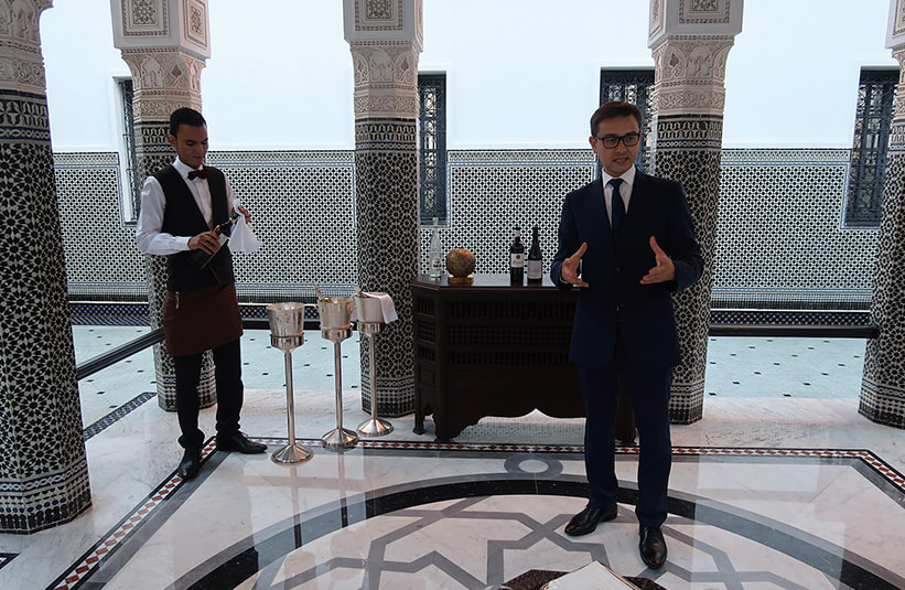 今回、ホテル側からモロカンワインのテイスティングに招待された。ホテルとしては初の試みで、単にテイスティングのみならず、チーフソムリエ氏がモロカンワインの歴史を解説し、コートヤードを占有して特別な講義形式で歓待して頂いた。ラ マムーニアの卓越したホスピタリティーと歴史に彩られた夢の空間は訪れるゲストを魅了している。
