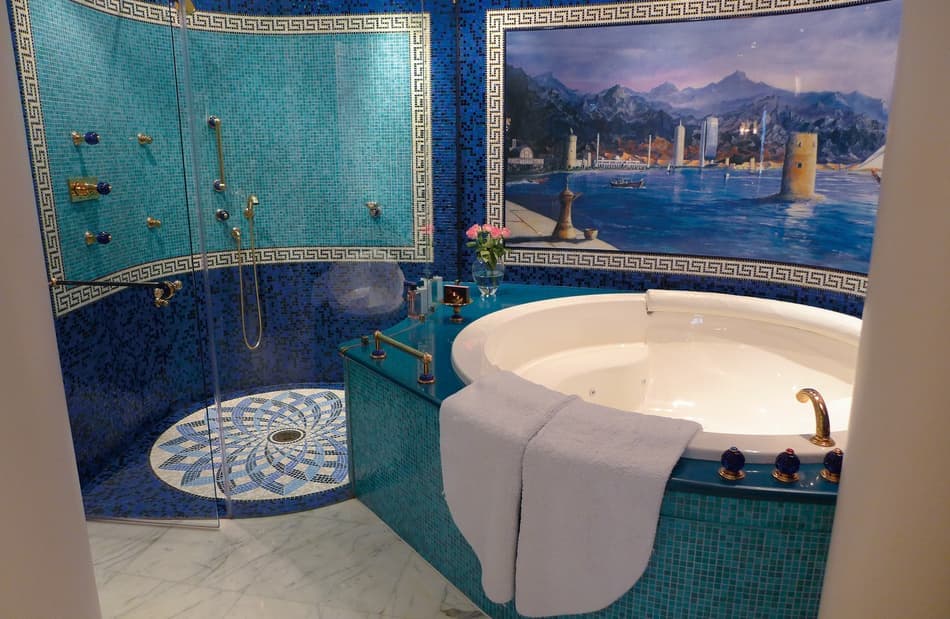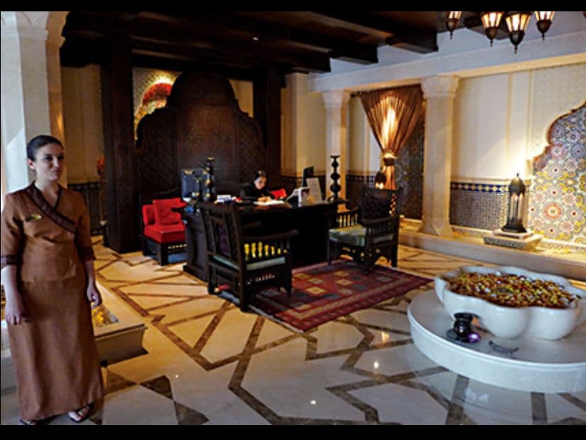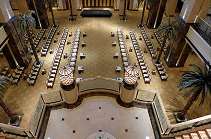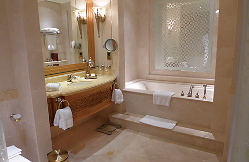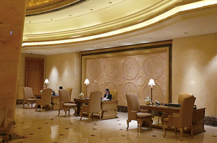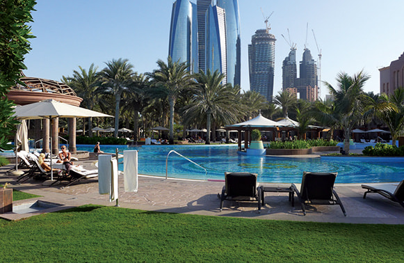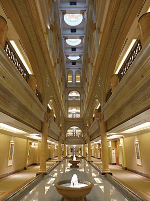検問所に準じたゲートを通ってからホテル正面エントランスまで、車でもかなりの時間を要する。館内は各首長の肖像画が飾られた小ホールを経て広大なグランドホールに導かれる。右手にレセプションとコンシェルジュデスクが配置され、民族衣装の制服に身を包んだゲストリレーションのスタッフが客室まで案内してくれる。筆者がアサインされた部屋は「Coral Room」の名称で約55㎡の広さがあり、芝生の向こうに竣工なった「Jemeirah Etihad Towers」を望む客室だ。直ぐに担当バトラーが挨拶に来て、必要なリクエストに対応してもらえる。ホテル内には14のレストラン、バーがあり、インターナショナル料理の「Le Vendome」、イタリアンの「Mezzaluna」そして地元アラブ料理の「Mezlai」がお勧めだ。建物の中心部には広大な空間が広がり、見上げるとゴールドやクリスタルの装飾で彩られた壮麗なメインドームに圧倒される。建物両翼には個別にスイミングプールが配置され、西翼側にアラビアンムードが漂うスパ「Anantara Spa」がゲストを迎える。さらにプールの先には、1.3㎞に及ぶ美しいプライベートビーチがペルシャ湾に広がっている。