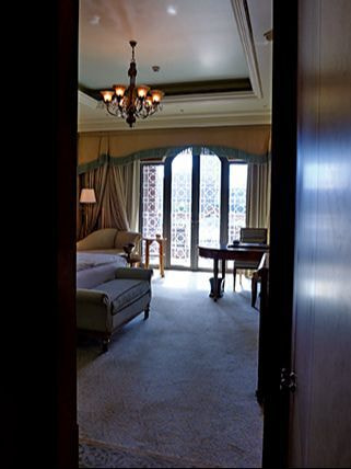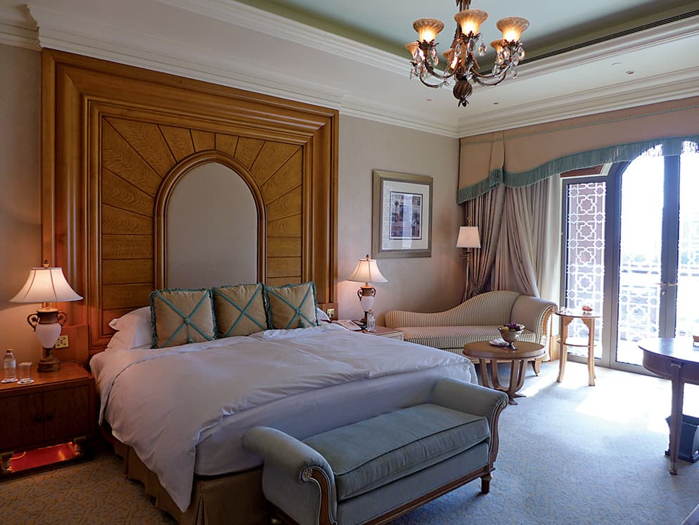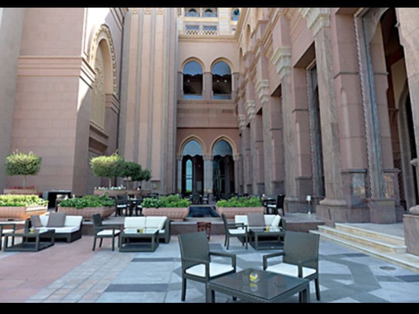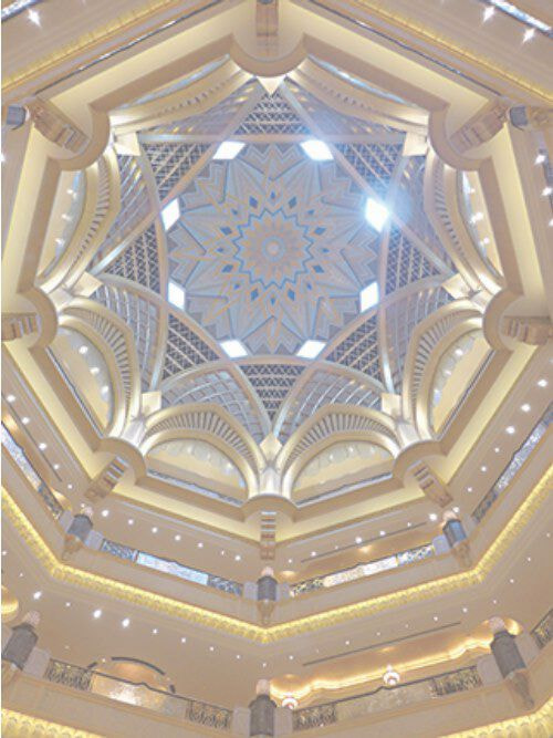 エミレーツパレスは30億ドルの巨費を投じ、ケンピンスキーから運営面での協力を得て2005年にグランドオープンした。ホテルの関連敷地は100万㎡に及ぶ壮大なもので、東西両翼に延びた建物の長さは1㎞以上もある。宮殿にも匹敵するホテル館内には114個のドームがあり、建物中央のドームは高さ72.6mの巨大なものだ。さらに使用されているシャンデリアの数は1002個に達し、最大のものは重量が2.5トンになるという。また、スイートを含む394のゲストルームに60か国から1200人の従業員を雇用している。まさに巨大なパレスそのもので、事実このホテルには迎賓館としての役割も備えており、国賓や王族しか利用できない豪壮な専用門が左手に威容を誇っている。