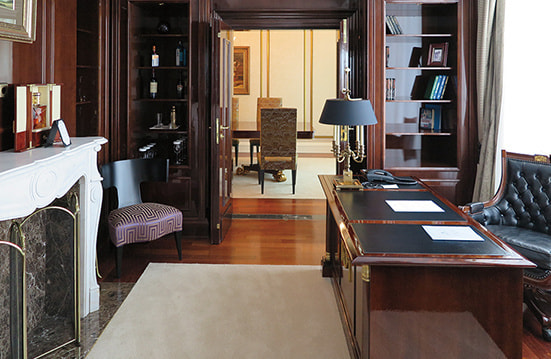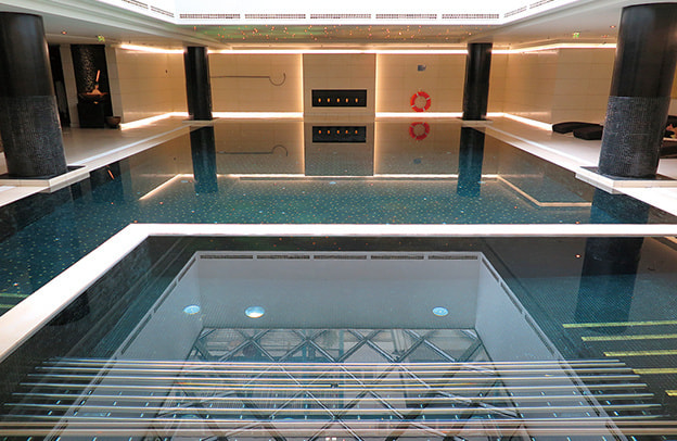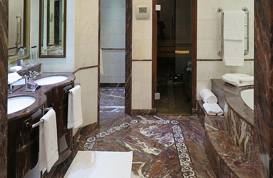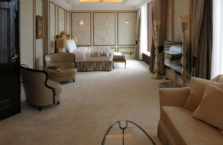 RC/Mは、スイートを含む全334室を擁す11階建ての建物で、ガラス天井のドーム型キャノピーがそのまま正面エントランス車寄せを覆っている。今回はホテル最大の面積を誇る「The Ritz-Carlton Suite」を紹介したい。キッチンや書斎を含む237㎡のスイートで、リビングや寝室から赤の広場が見渡せる。レストランは充実しており、前述した「O2 Lounge」以外にも、メインダイニングの「Café Russe」、オールデイダイニングの「Novikov Restaurant & Bar」など多彩な構成である。スパ「The Ritz-Carlton Spa in Moscow 」の設備は充実しており、スイミングプールやトレーニングジムはもちろんだが、特に医学的見地からセラピーを施術する独立したコーナーは特筆に値する。