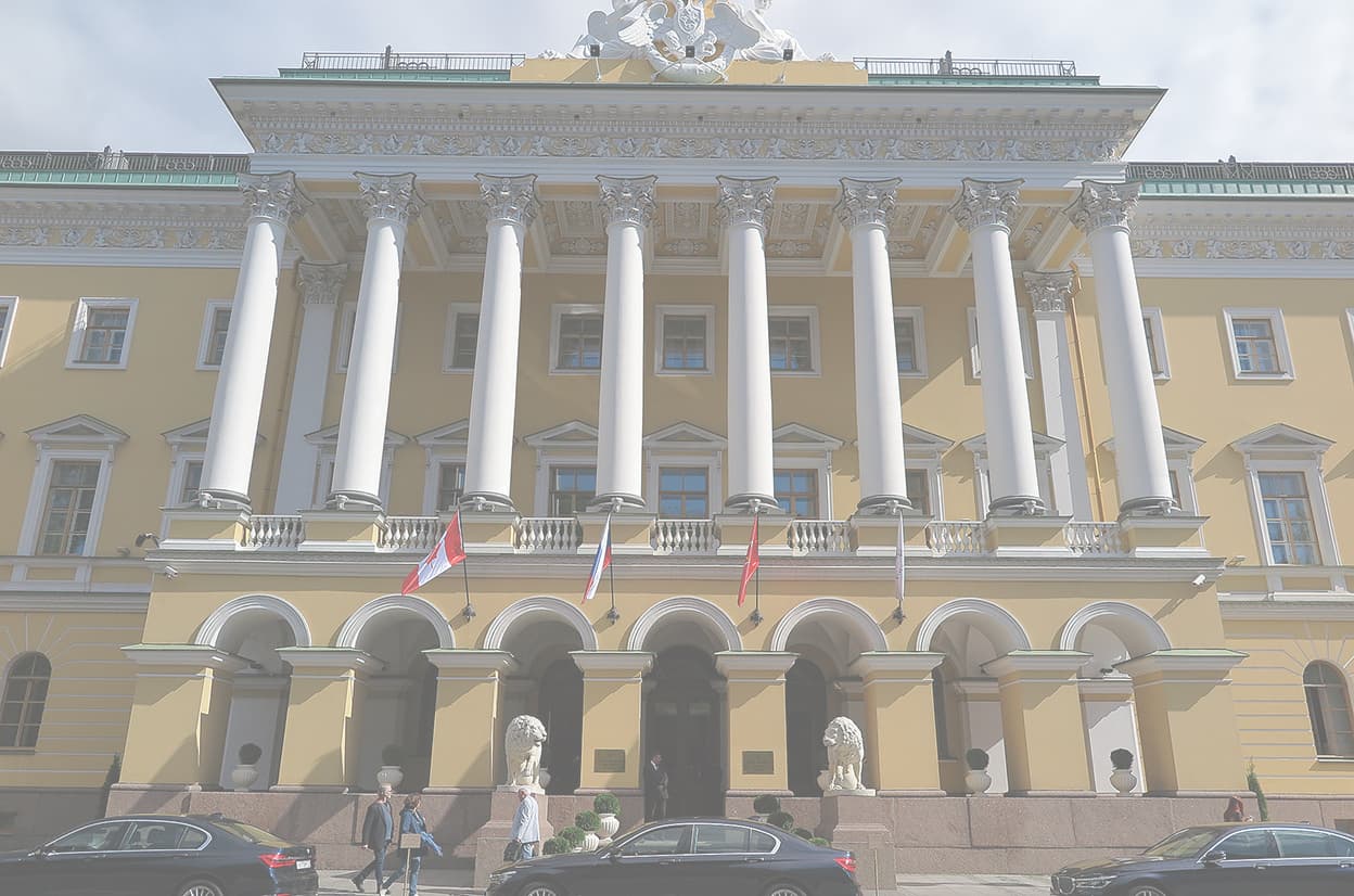ライオンパレスの名称は、正面エントランスに鎮座する大理石で造られた一対の獅子に由来する。旧海軍省の前面に位置し、“The House with Lions”として知られる壮麗な宮殿は、1817年の建設着工以来、旧ロシア帝国軍事省として使用され、戦後は政府の建築局など色鮮やかな歴史に彩られてきた。聖イサーク大聖堂の真横に建つこの歴史的建造物は、大聖堂と同じ著名なオーギュスト・モンフェランの設計により建設されている。