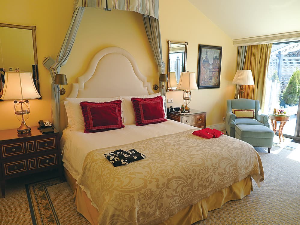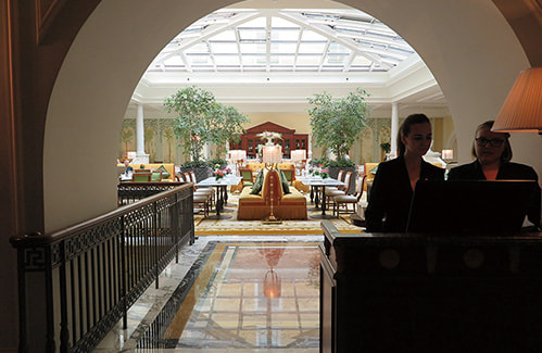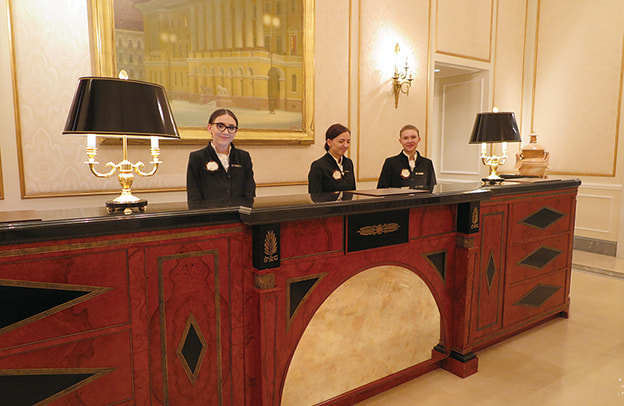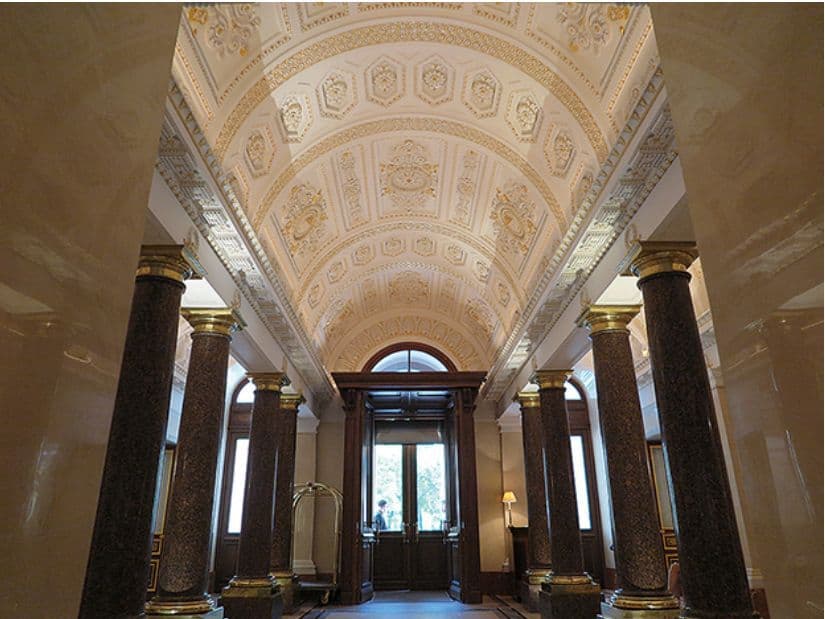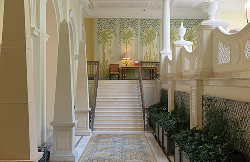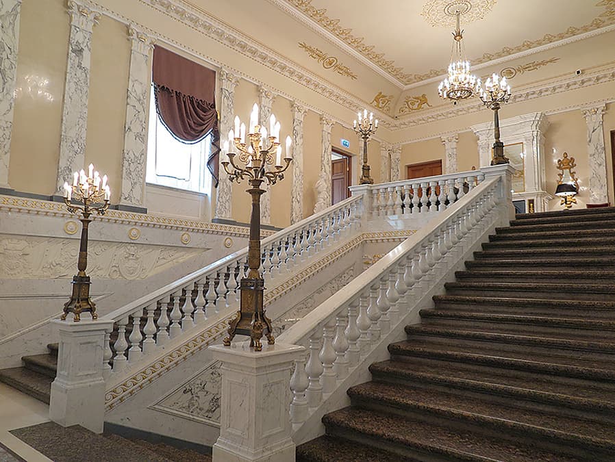 FS/LPの館内に一歩踏み入れると、1820年代帝政ロシアの華やかなりし宮殿の香りが飛び込んでくる。エントランスホールから太い円柱の続く回廊は、天井の精緻な彫り物と相まって重厚感あふれる造りである。圧巻はホール奥に佇むステアケースだ。白亜の大理石にゴールドの紋様を付けた華麗な階段と、レリーフで飾られた壁面の空間は息をのむくらいのオーラを放ちホテルの白眉と言える。