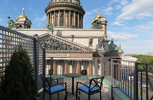 FS/LPは26室のスイートと157室のゲストルームを擁し、2頭の獅子を従えた正面ファサードはまさに現代の宮殿といった趣である。筆者にアサインされた部屋は最上階に位置する「Four Seasons Terrace Room」で、張り出した専用テラスから聖イサーク大聖堂を真正面に望む人気の客室だ。レストランは、シンガポール、東京、香港の頭文字を取ったアジアンテイストの「Sintoho」があり、すしカウンターや鉄板焼きコーナーもある。“旅の道程”という意味のモダンイタリアン料理の「Percorso」は、4つのゴージャスな部屋に分かれている。また中心部に位置しトップライトから淡い陽光が入る「The Tea Lounge」で用意される朝食は楽しい。スパ施設「Luceo Spa」は伊フィレンツェの世界最古の薬局「Santa Maria Novella」のオイルを使用したアロマセラピーが人気である。
