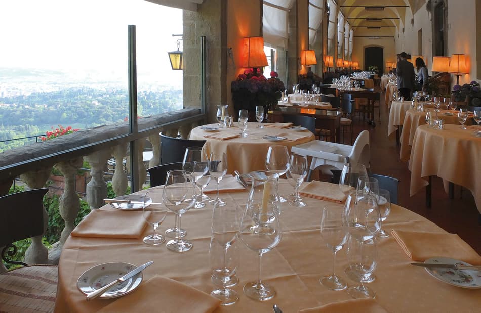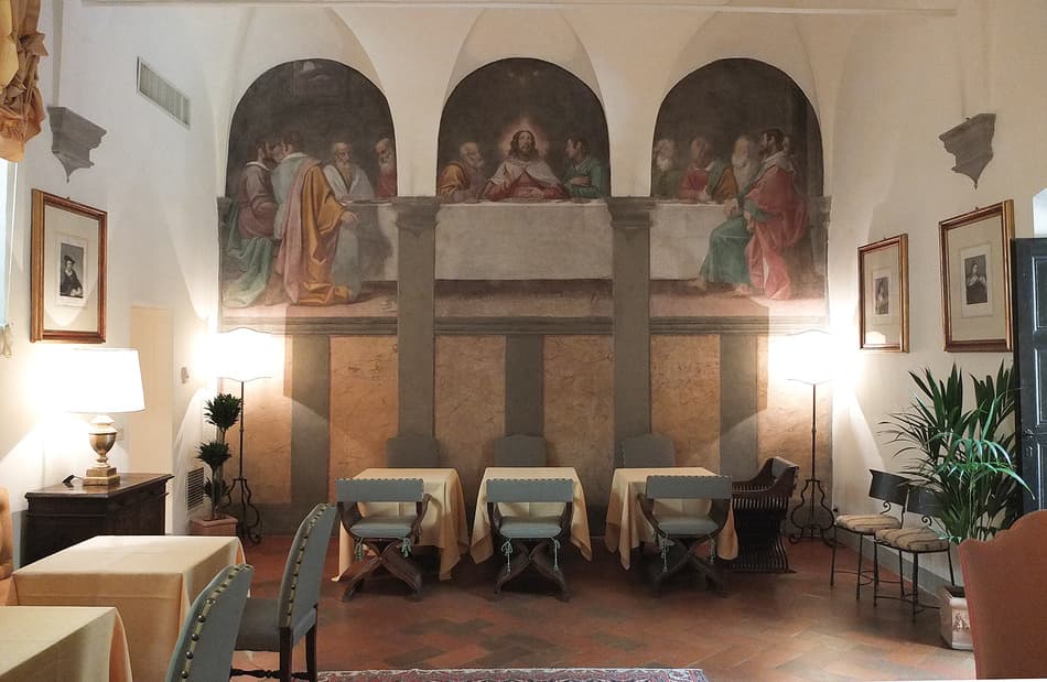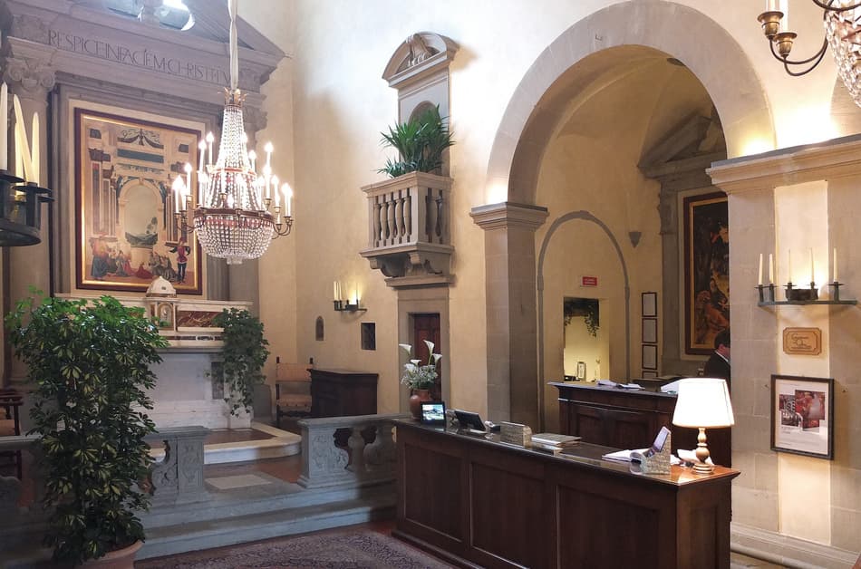 館内に一歩踏み入れるとレセプションデスクがあるが、その荘厳な雰囲気に驚かされるであろう。実にこの空間はかつての礼拝室であり、一段高い所にある祭壇と隣接する事務系のデスクが違和感なく一体化され、天井から下がる豪華なシャンデリアと共にその室内レイアウトの妙に感服させられる。館内を奥に進むと明るいトップライトの大広間に辿り着く。ここはバー・ラウンジ「The Cloister Bar」で、朝食時にはビュッフェの幅広い料理が並ぶ空間にも利用されている。さらに隣にはキリストの「最後の晩餐」のフレスコ画が残されているダイニングの別室もある。ラウンジの先にはフィレンツェ市街の圧倒的な景色を一望できるメインダイニング「The Loggia」がある。固定のガラス窓はなく、半オープンエア方式で回廊を利用した気持ちの良いダイニングだ。ここでは食とワインの聖地、トスカーナの極めて質の高い豊穣の料理を楽しむことができ、宿泊客以外でも多くの食通が訪れている。