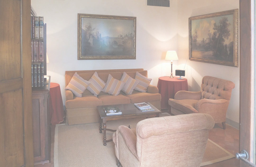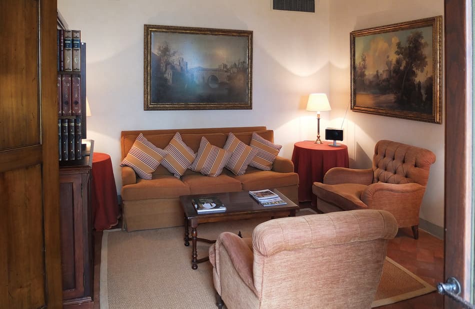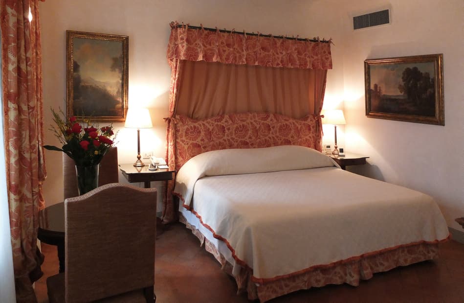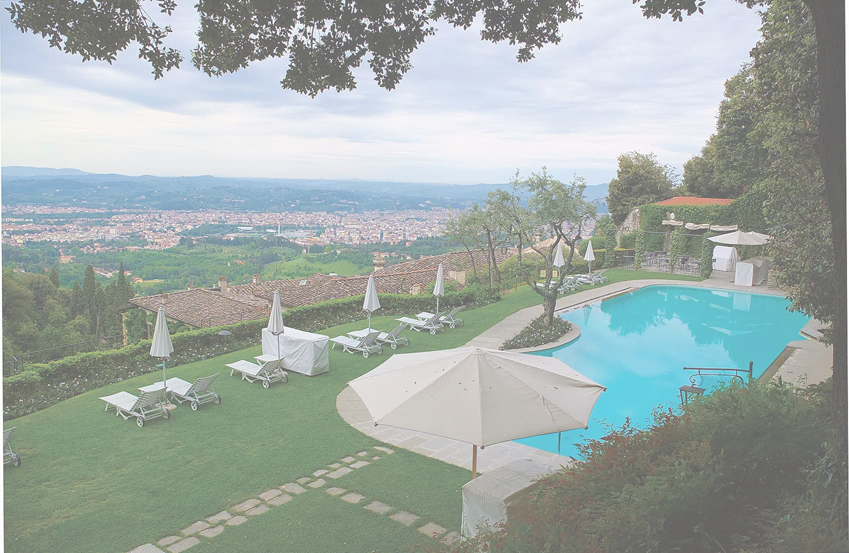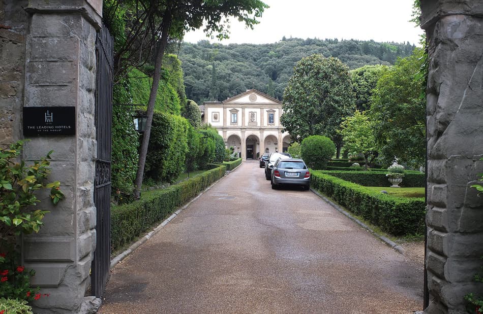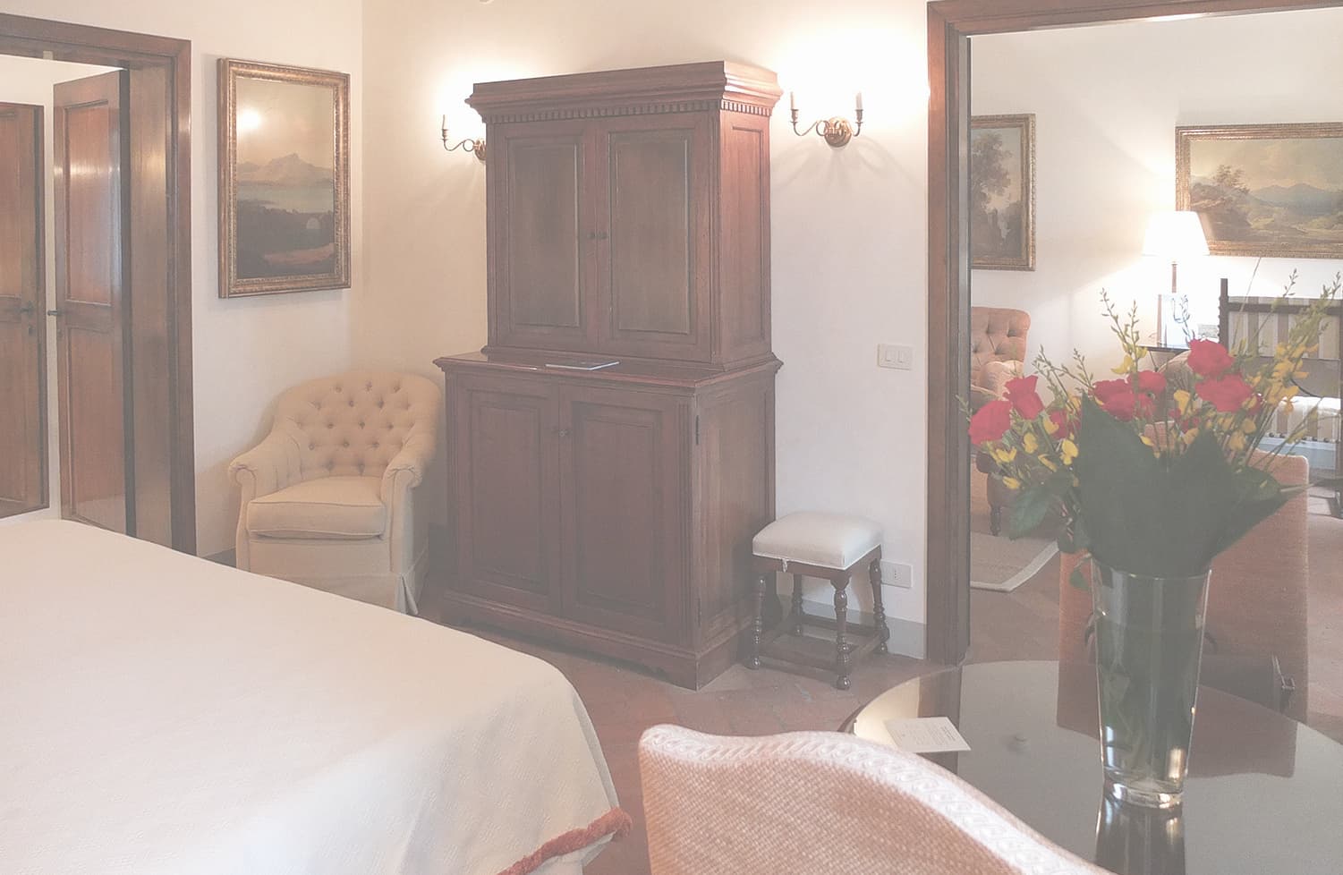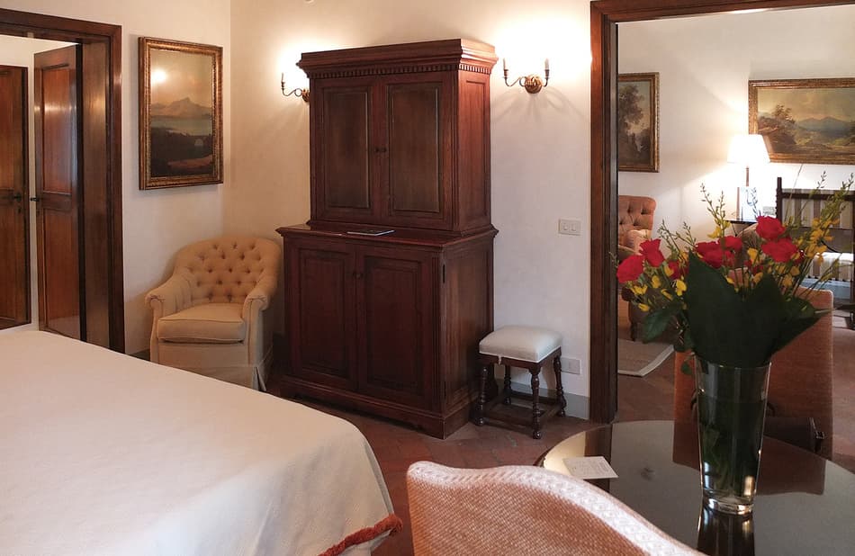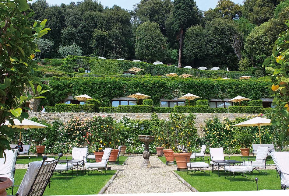 ホテルは21の客室と25のスイートを有するゆったりとした客室構成だ。スタンダードの客室は主に旧修道院の本館にあり、裏手の広大な芝生の庭園にはレモンやオリーブの木々、そしてバラが咲き乱れるイタリア式庭園を散策できる。庭園から丘の上にある温水プールに向かって階段状にテラス付きジュニアスイートが並んでいるが、すべて建物は蔦に覆われていて景観を損なわぬ配慮がなされている。反対側の山の斜面にはフィレンツェの市街を望む専用ガーデンが付随したスイートヴィラが佇んでいる。夕暮れ時、周囲がオレンジ色に染まり遠くドゥオーモやベッキオ宮殿が浮かんで見える景色は息をのむほどだ。