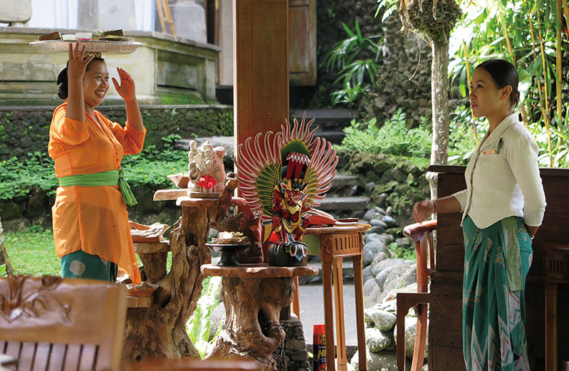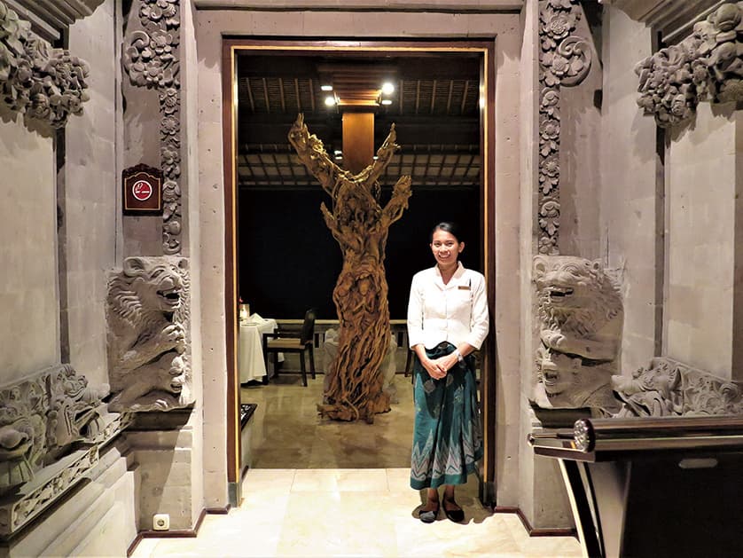 ロイヤル ピタマハは現地の伝統を感じながら上質なサービスを満喫できると評判だが、きめ細かなサービスの陰には一人の日本人女性の支えがある。マンデラ は1988年にウブドの元王族に嫁ぎ、王族の子孫が運営するこのホテルのパブリック&ゲストリレーションズ コーディネイターとして活躍中。いわば、日本でいう女将の役割を担い、ホスピタリティの徹底をスタッフ全員に教育している。