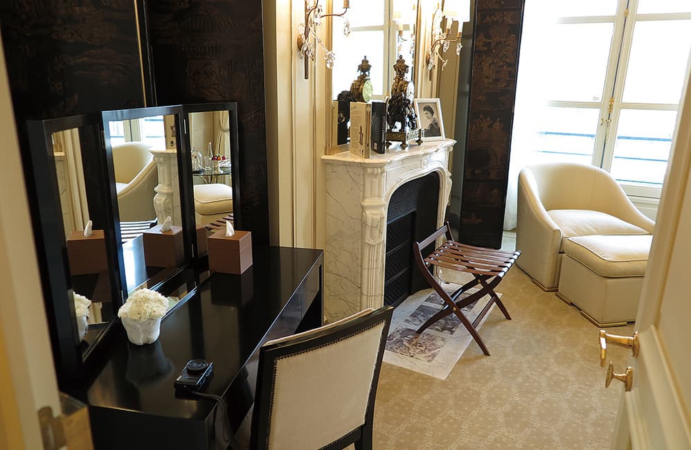 去年2016年6月、新生リッツ パリはヴァンドーム広場にその栄光の扉を再び開いた。大改修を開始してから実に4年の歳月が経過していた。新生リッツ パリは建物外壁も綺麗に修復され、隣接するフランス司法省の黒ずんだ外壁との対比が象徴的である。筆者にアサインされた部屋はリッツを代表する「Coco Chanel Suite」で、シャネルの写真や化粧机、シノワズリーの屏風などフェミニンな空気が流れるスイートだ。ベージュを基本と室内は気品に満ち、窓からはヴァンドーム広場の壮麗な佇まいを望む。ここはシャネルの美意識が息づく特別な“家”とも言える。